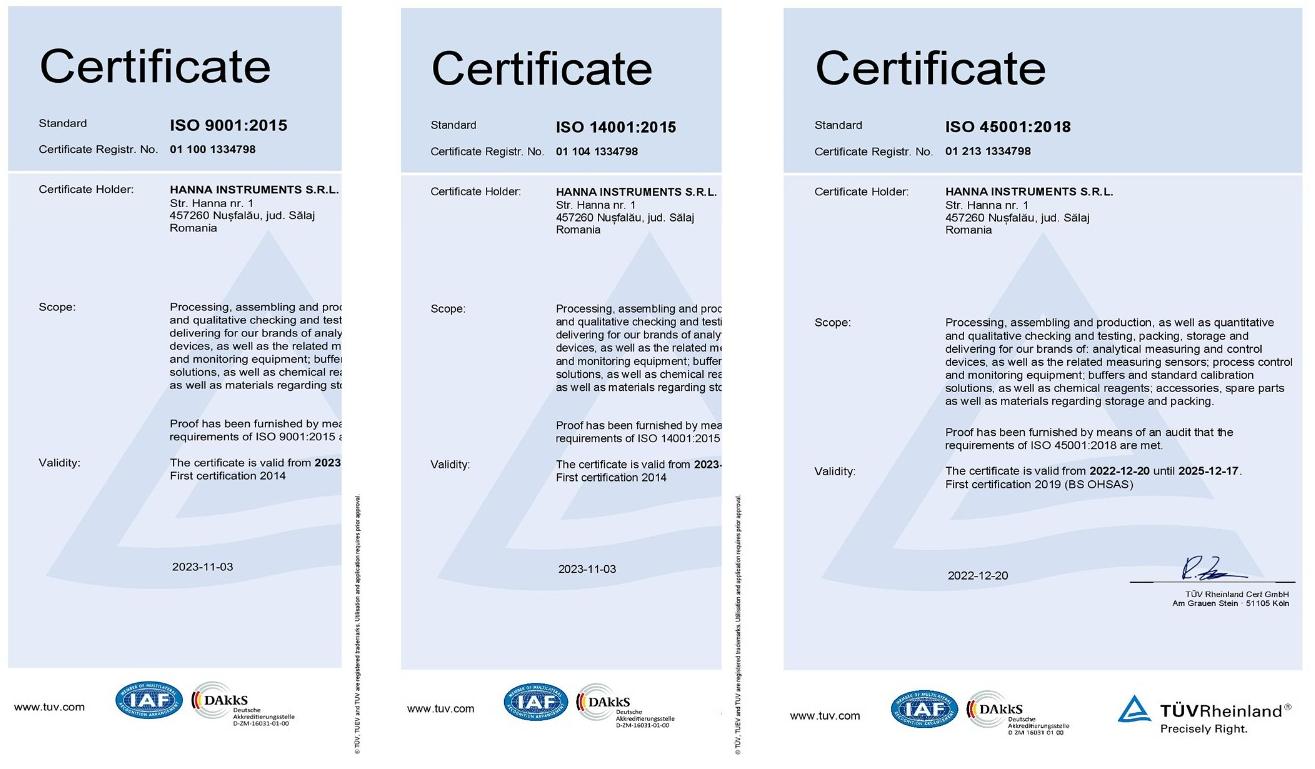 Hanna Instruments bleibt dem Streben nach Exzellenz und kontinuierlicher Verbesserung verpflichtet. Die ISO-zertifizierten Produktionsstätten des Unternehmens gewährleisten die Zuverlässigkeit und Genauigkeit seiner Instrumente.